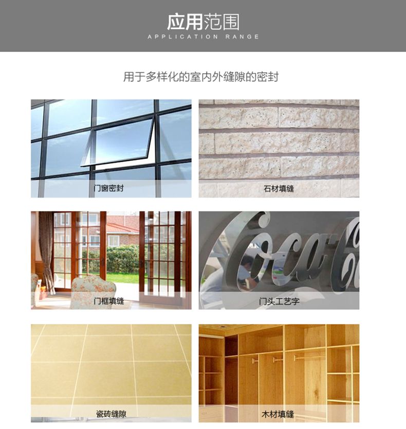 使用范圍:各類高端門窗、重型移門、鋁門窗、塑鋼門窗安裝填縫密封;玻璃、瓷磚、混凝土、石材填縫密封;室內外裝修粘接密封;其它多種用途。