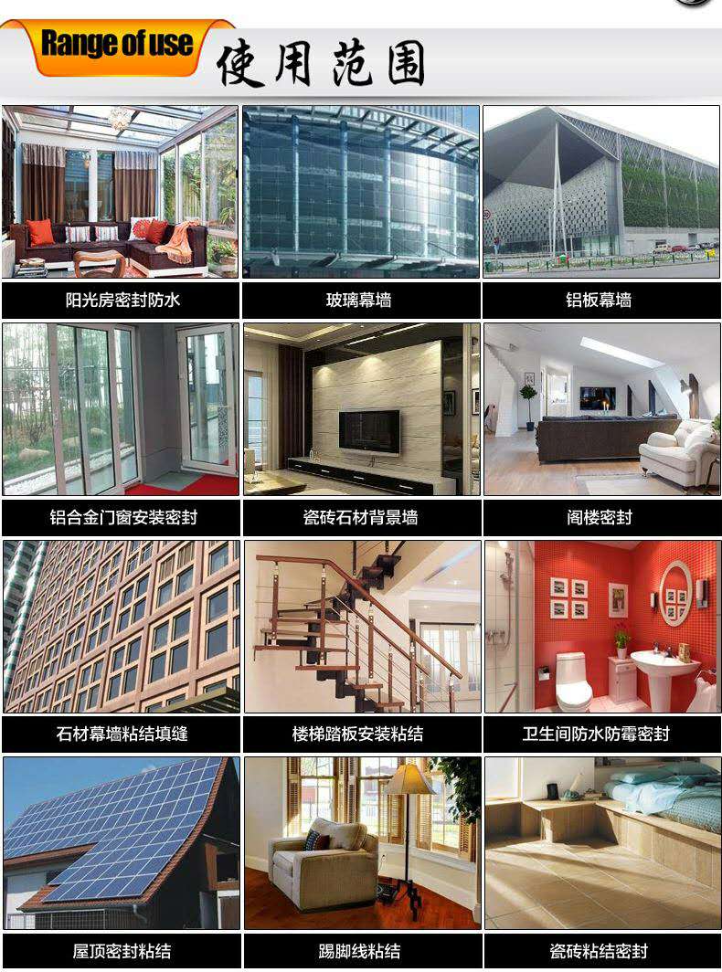 使用范圍:適用于中、小型明框幕墻、陽光房、鋁塑板、鋁單板、玻璃工程、外墻工程、石材、鋁合金、金屬、陶瓷等材料的粘結密封。